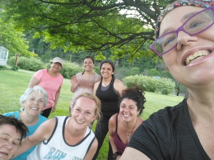 These kinds of early evenings find this urban green space full of kids on bikes, people walking dogs and occasionally, folks sitting under trees with picnic baskets. By the time we are finishing up class at 7:00 PM, there are but a few people scattered throughout the expansive space that hugs the river on one side and the railroad tracks on the other. Several evenings, our yoga class has observed with awe, the sight of a bald eagle and a juvenile eagle gliding low over the river, perhaps looking for food. This sighting never gets old and is met with cries of delight.